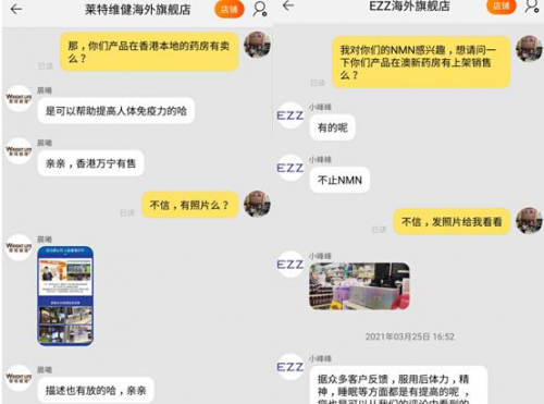 值得注意的是,这并不是行业的全部,在暗访中,仍有部分品牌给出了海外上架的直接证明。除了NMN行业首个海外上市公司EZZ向记者展示了其在澳新药房的上架照片外,香港NMN品牌莱特维健也表示,其产品已上架香港本地的健与美连锁品牌万宁。