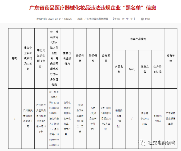 网络整理 2021-04-02 09:59中国网财经3月31日讯 今日,广东省药监局发布的“药品医疗器械化妆品违法违规企业‘黑名单’信息”显示,广州鹏美精细化贸易有限公司因使用化妆品禁用原料生产化妆品,情节严重,被吊销《化妆品生产许可证》,并被列入“黑名单”。
