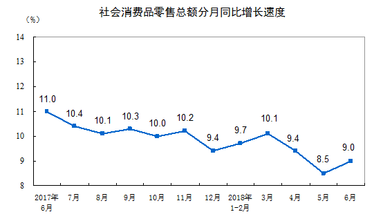 网络整理 2021-03-22 10:292018年6月份社会消费品零售总额增长9.0%