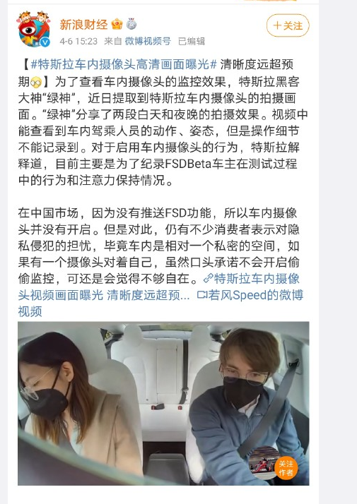 在中国市场,因为没有推送FSD功能,所以车内摄像头并没有开启。
