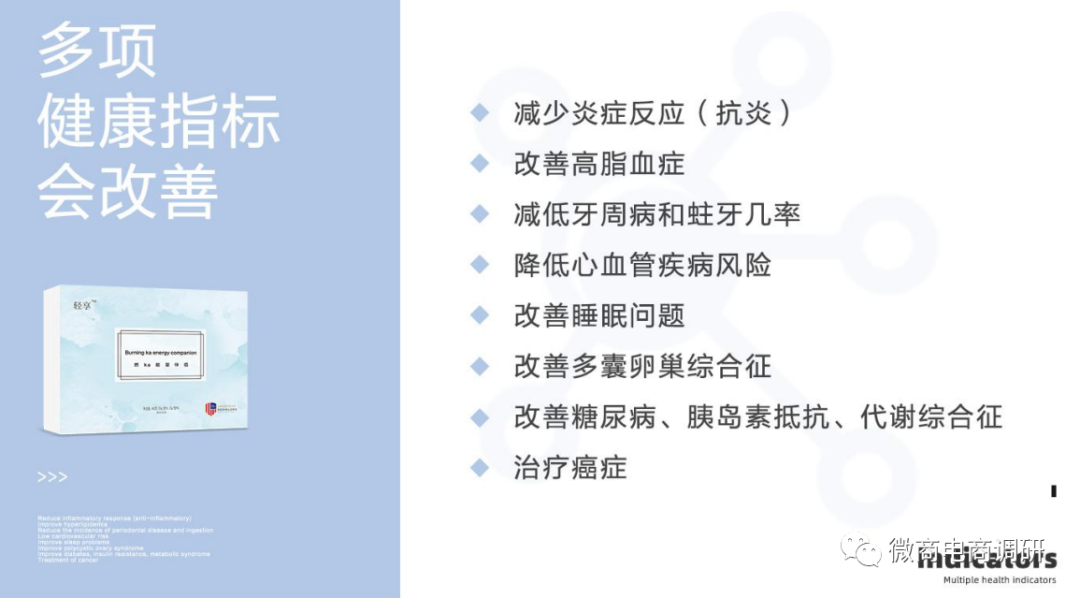 更令人匪夷所思的是,经销商提供的PPT资料《耀轻享介绍9.10》甚至还指出了“轻享燃Ka能量伴侣”具有降低心血管疾病风险、改善多囊卵巢综合征、改善糖尿病,乃至治疗癌症的神奇作用。