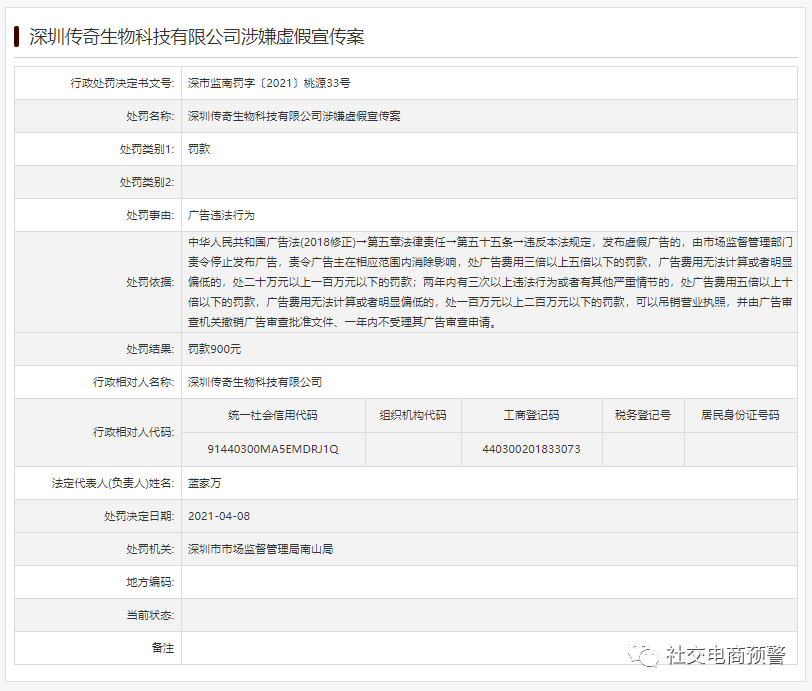 转载请标注:信息网——深圳传奇生物科技公司“虚假宣传”被罚