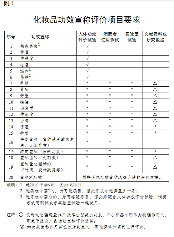 针对具体的功效宣称内容,《规范》第十条规定,具有祛斑美白、防晒、防脱发、祛痘、滋养和修护功效的化妆品,必须通过人体功效评价试验方式进行功效宣称评价。