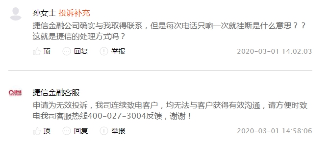 根据IRR公式计算,此笔借款年利率高达51.35%,而捷信在处理该笔投诉时的方式也颇为有趣,借款人孙女士称,捷信确实与其取得联系,但是每次电话只响一次便挂断,随后捷信方面以“我司连续致电客户,均无法与客户取得有效沟通”为由申请投诉无效。