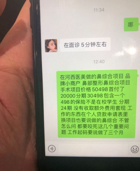 一名19岁的学生想做医美手术,在与医院沟通后直接被捷信工作人员以“洗脑式”套路强迫该学生借款,微信聊天记录显示,手术项目价格50498元,首付20000元,分期借款30498元,并且包含498元的保险费用,分24期还款。