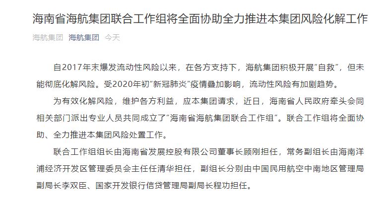 海航集团表示,联合工作组组长由海南省发展控股有限公司董事长顾刚担任,常务副组长由海南洋浦经济开发区管理委员会主任任清华担任,副组长分别由中国民用航空中南地区管理局副局长李双臣、国家开发银行信贷管理局副局长程功担任。