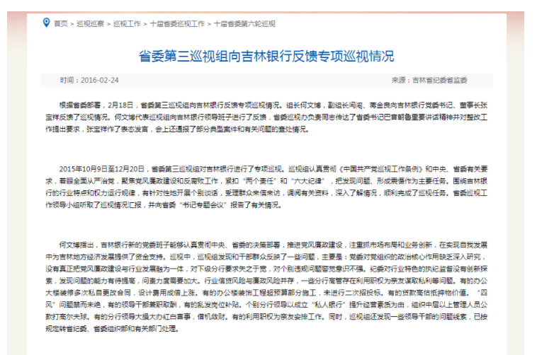 2016年2月24日,吉林省纪委省监委官网对该次会议内容进行了公示。记录显示,2015年10月9日至12月20日,吉林省委第三巡视组对吉林银行进行了专项巡视(如图2所示)。