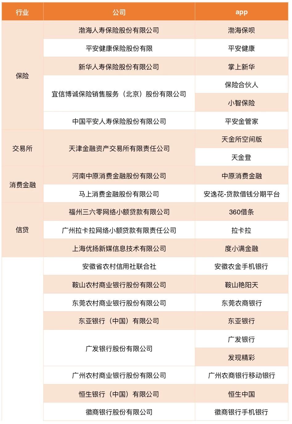 例如,根据中国人民银行 (银发〔2019〕237号)文件,消费金融公司、信贷公司、交易所并不在本次备案范围,但是均出现在协会披露的备案名单中。这些公司分别是马上消费金融(App:安逸花-贷款借钱分期平台)、河南中原消费金融(App:中原消费金融)、福州三六零网络小额贷款有限公司(App:360借条)、广州拉卡拉网络小额贷款有限责任公司(App:拉卡拉)、上海优扬新媒信息技术有限公司(App:度小满金融)和天津金融资产交易所有限责任公司(App:天金所空间版)。