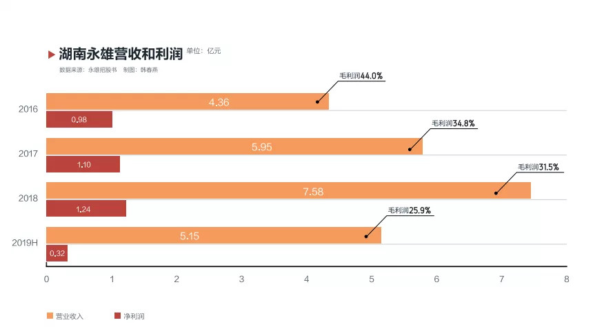 随着地区分公司的关闭,湖南永雄盈利减退凸显。根据湖南永雄的财务报告数据,2018年和2019年上半年,分别实现营业收入7.58亿元和5.15亿元,净利润分别为1.24亿元和3230万元,同比减少了32%。