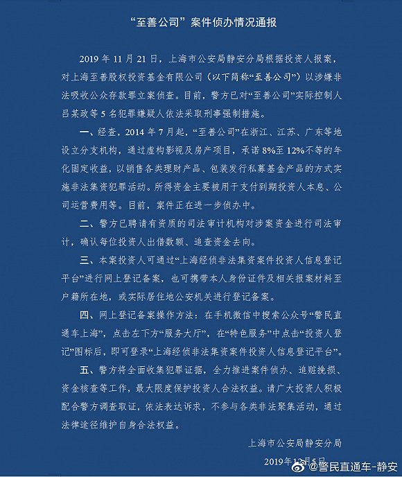 网络整理 2021-03-21 23:39网贷之家讯 12月5日,上海市公安局静安分局通报,2019年11月21日,上海市公安局静安分局根据投资人报案,对上海至善股权投资基金有限公司(以下简称“至善公司”)以涉嫌非法吸收公众存款罪立案侦查。目前,警方已对“至善公司”实际控制人吕某政等5名犯罪嫌疑人依法采取刑事强制措施。
