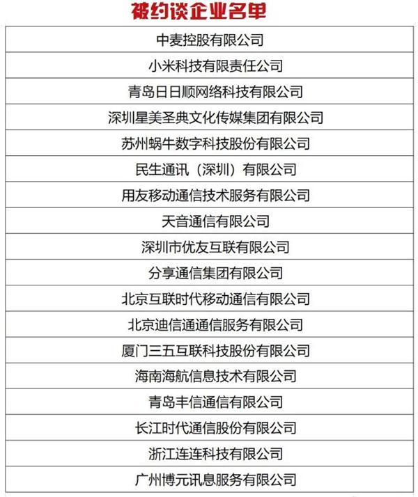 其中,小米科技有限责任公司、深圳星美圣典文化传媒集团有限公司、民生通讯(深圳)有限公司、分享通信集团有限公司、北京迪信通通信服务有限公司、海南海航信息技术有限公司均为今年以来第二次被约谈的企业。