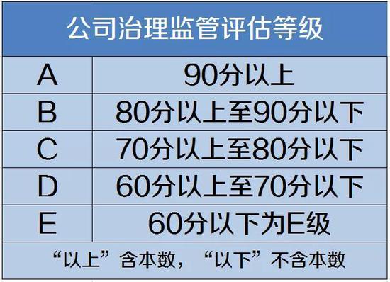 公司治理监管评估总分值为100分,评估等级分为五级:A级、B级、C级、D级和E级。被评为D级和E级的公司将在业务开办和机构增设等方面被采取监管措施和行动。