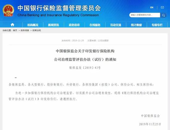 银保监会有关部门负责人表示,规范、有效的公司治理是金融机构长期稳健发展的重要基石。近年来,银行业和保险业暴露出的诸多风险,归根溯源,都是因为公司治理机制的不健全或运作失效。制定出台《办法》是中国银保监会坚决打好防范化解重大金融风险攻坚战的重要举措。定期开展监管评估,有助于监管部门更加及时和全面地掌握机构公司治理状况,及时有效防范化解风险,更好地保障金融消费者的合法权益。同时,《办法》有助于进一步明确监管导向,推动银行保险机构提升公司治理水平,实现可持续发展。