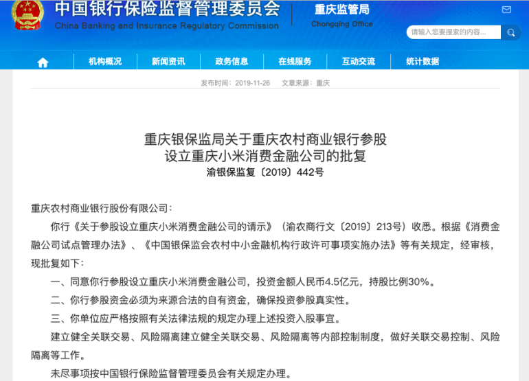 网络整理 2021-03-21 23:4411月26日,重庆银保监局官网发布《关于重庆农村商业银行参股设立重庆小米消费金融公司的批复》,同意重庆农村商业银行参股设立重庆小米消费金融公司,投资金额人民币4.5亿元,持股比例30%。